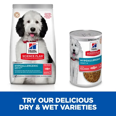 Hill's Science Plan Hypoallergenic Adult Large Breed s lososom potpuna je hrana za velike pse od 1-6 godina. Ova je hrana osobito prikladna za preosjetljive pse zbog ograničenih, izvora proteina visoke kvalitete iz ukusnih lososa i tune te sastava bez žitarica.Ukusni krumpiri nadopunjuju jelovnik, a ujedno mogu biti i nježni za želudac vašeg četveronožnog prijatelja. Osim toga, omega-3 i omega-6 masne kiseline također mogu pridonijeti njezi dlake i kože. Ukusna suha hrana Hill's Science Plan Hypoallergenic Adult Large Breed s lososom stoga je idealna za potrebe osjetljivih pasa, a istovremeno oduševljava vašeg ljubimca izvrsnim okusom.